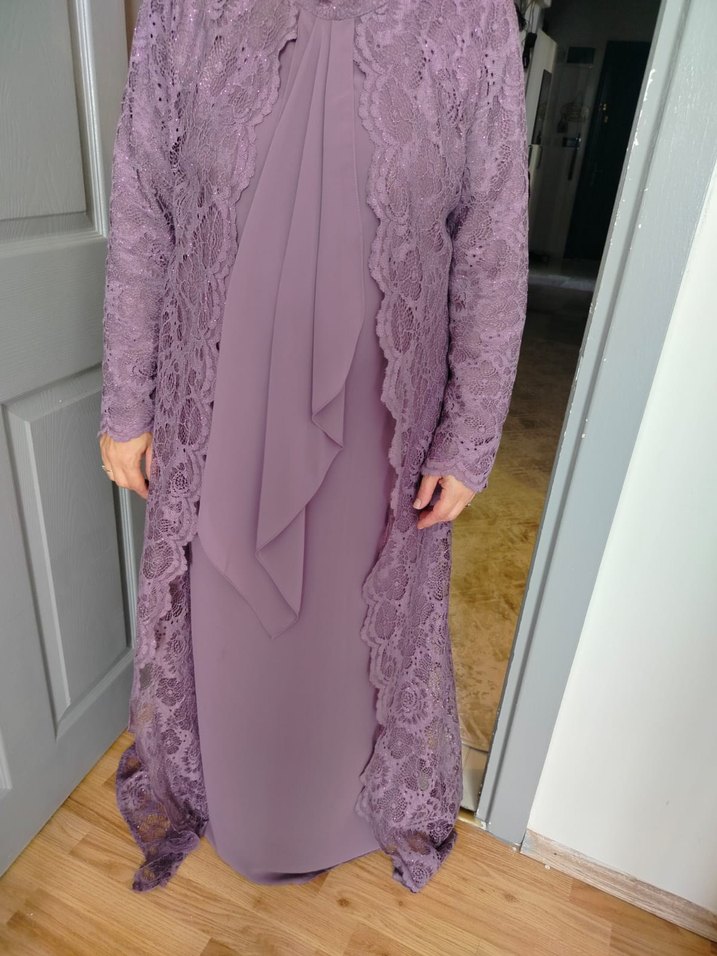 Uzun mor renkli, drapeli, notalı yaka ve uzun kollu kadın abiye elbise. Rahat kesimli ve dantel detaylı, düğünler için uygun. Boyu 145 cm. Çok şık sorunsuz harika bir abiye. Alıcısına hayırlı olsun