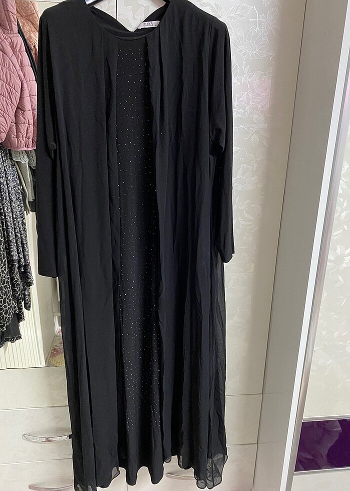 Siyah renk iç astarı taşlı sandy kumaş içindeki elbise üzeri tüllü 4 beden (5 xl giyen birine denk geldi) SURA marka