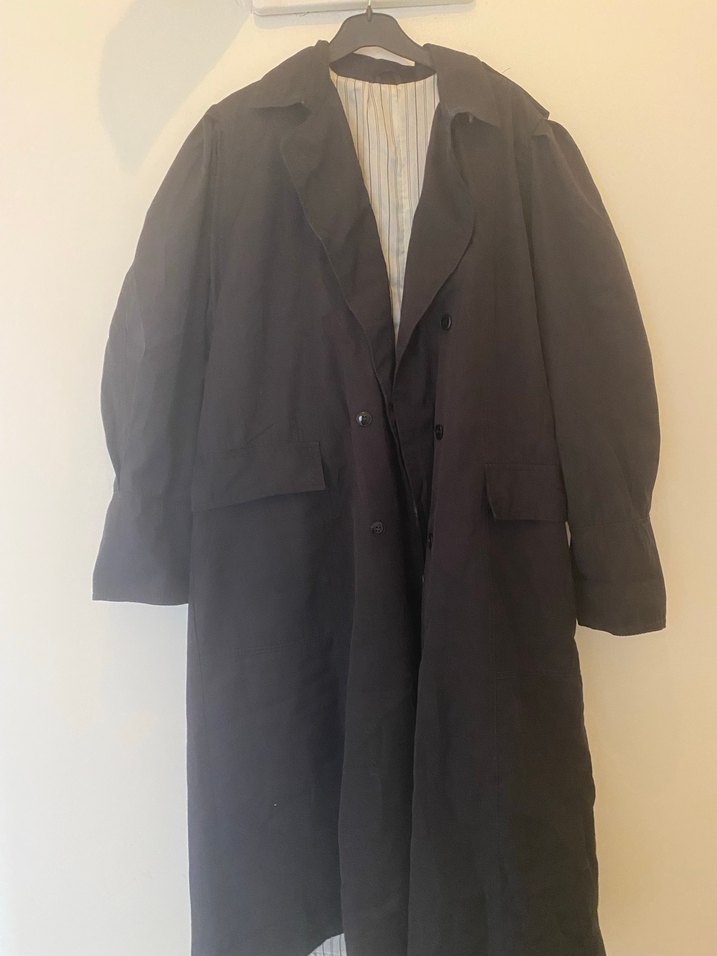 düğmeli ve uzun kollu, bol kesim koyu renk trençkkr Ofis için uygun, normcore tarzda, kesimli yakaya sahiptir.