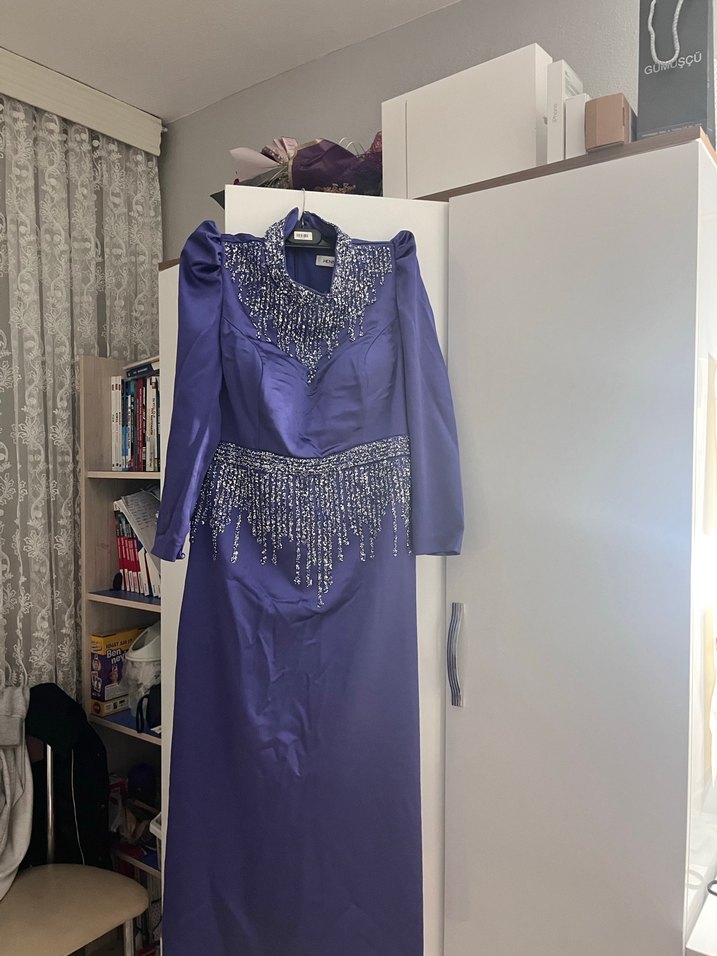 Uzun kollu, mor renkli, nakışlı ve drapeli fit kesim abiye elbise. Yüksek yakalı ve parlak yüzeyli, vintage klasik şıklığı yansıtır. Düğün için uygundur.