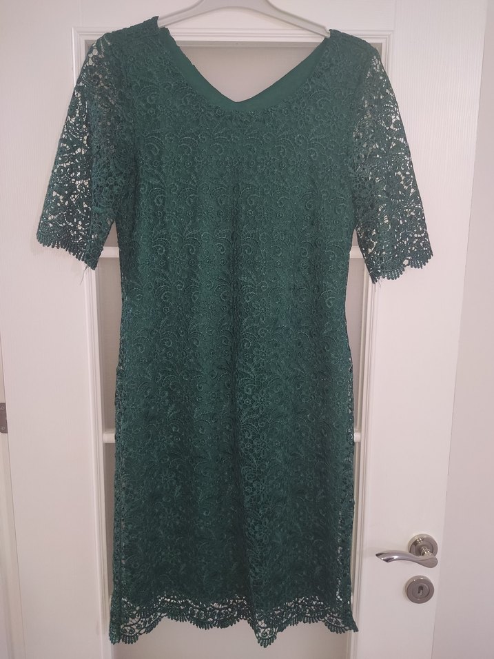 Koyu yeşil renkli, V yakalı ve kısa kollu, dantel kumaştan yapılmış, klasik ve bohem vintage tarzda, midi boyda, vücuda oturan elbise. Elbise boyu 105 cm'dir. 44-46 beden arası. Yarım kolludur.