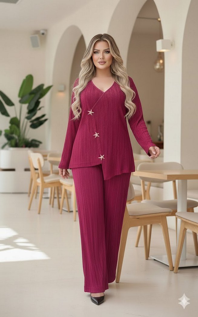 Büyük Beden Yıldız Düğme Detaylı Bordo Takım