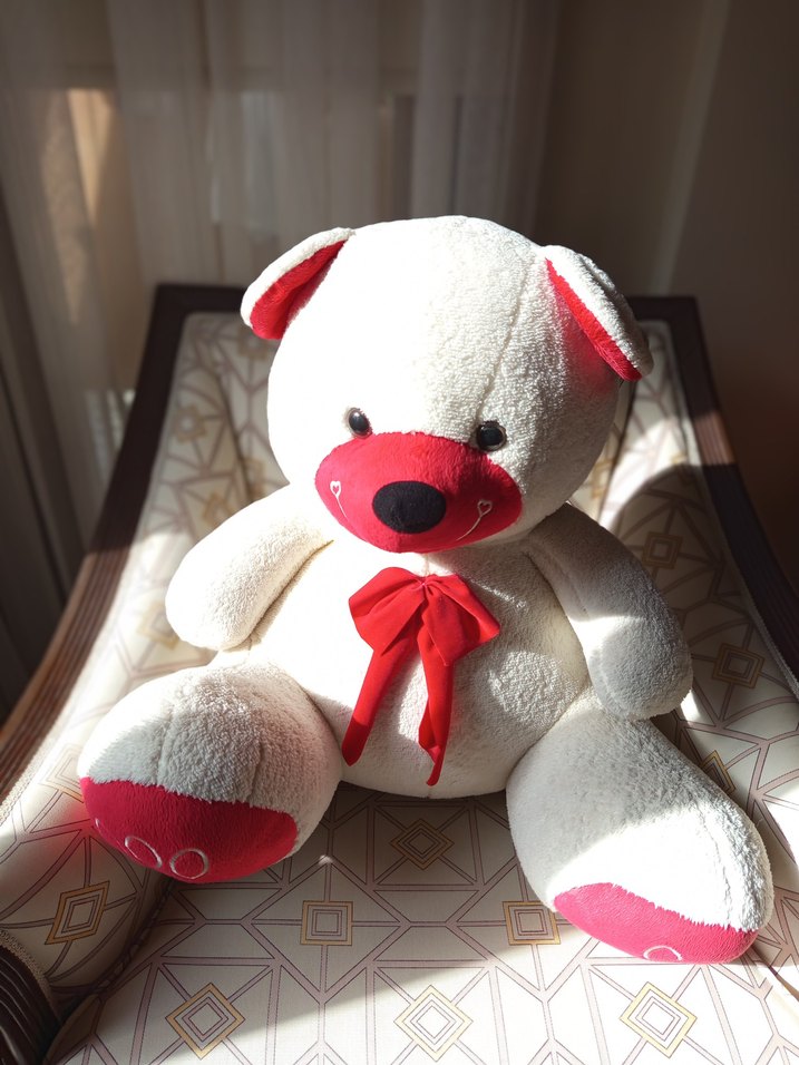 Yumuşak beyaz peluş ayıcık, kulak, burun, pati ve boynunda renkli kırmızı detaylar ve fiyonk ile süslenmiştir. ölçüleri fotoğraflanmıştır.