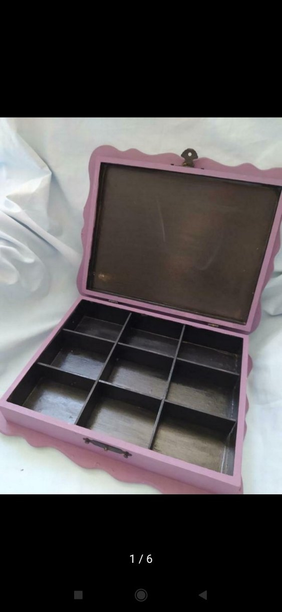 Ahşap makyaj kutusu, koyu renk iç kısmı ve çoklu bölmeleriyle kozmetik ve aksesuarlar için düzen sağlar.