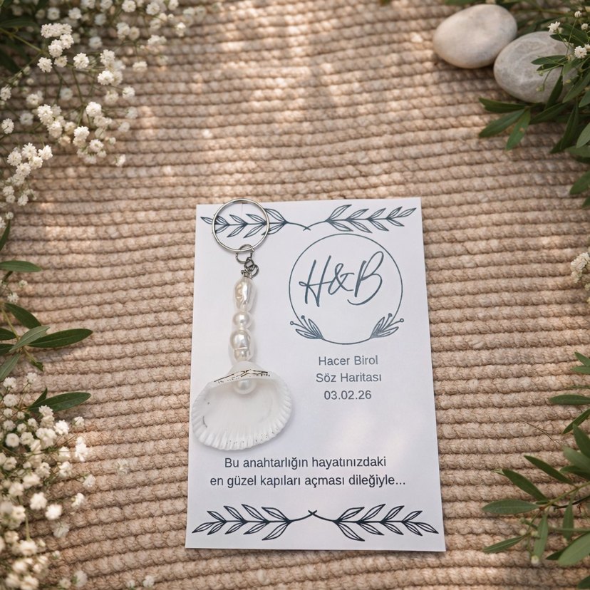Boncuklu ve deniz kabuğu detaylı beyaz bohem kadın anahtarlığı, en güzel kapıları açması dileğiyle gelen kart eşliğinde.