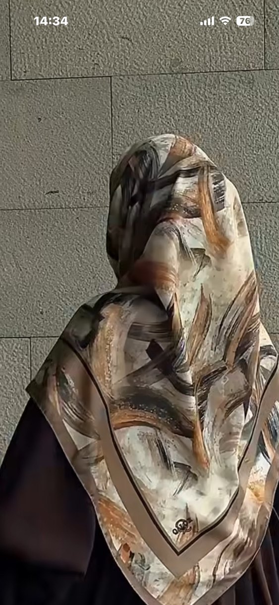 Yumuşak sentetik kumaştan, bej ve gri soyut desenli, drapeli bohem ve avangard tarzda kadın
