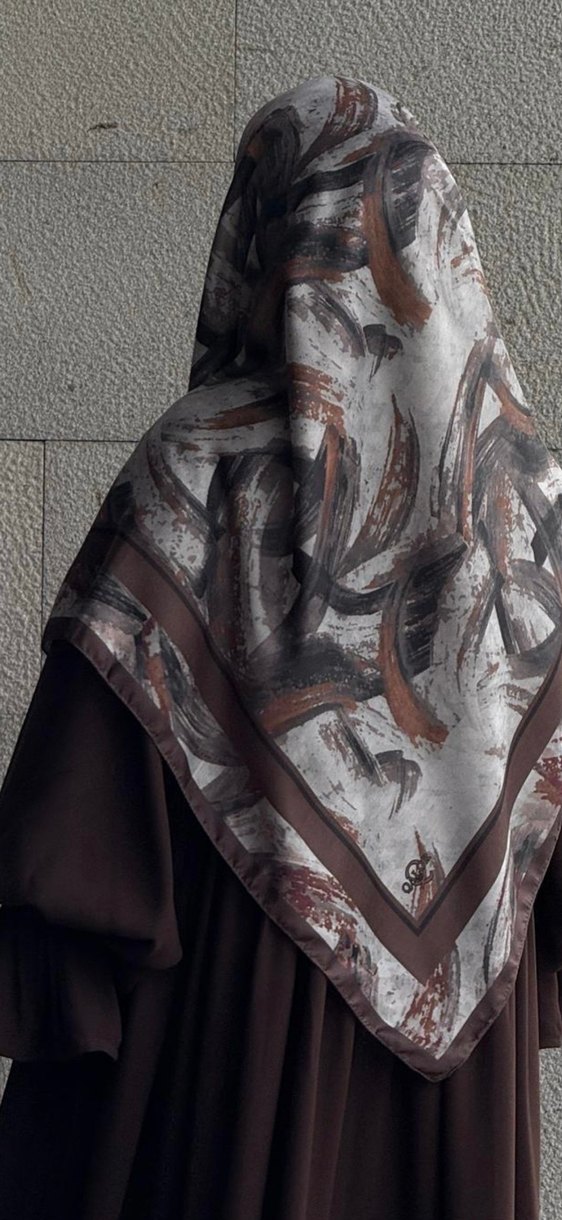 Kahverengi ve gri tonlarda, drapeli avant-garde tarzda kadın fular. Sentetik kumaştan, trend belirleyiciler için şık bir aksesuar.
