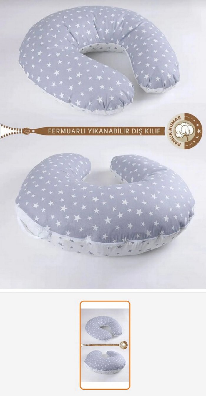 Gri yıldız desenli emzirme ve hamilelik yastığı, fermuarlı ve yıkanabilir dış kılıfa sahiptir.