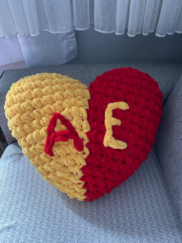 Kırmızı ve sarı renklerden oluşan, el yapımı işlemeli kalp şeklinde yumuşak ve dekoratif yastık. ❤️