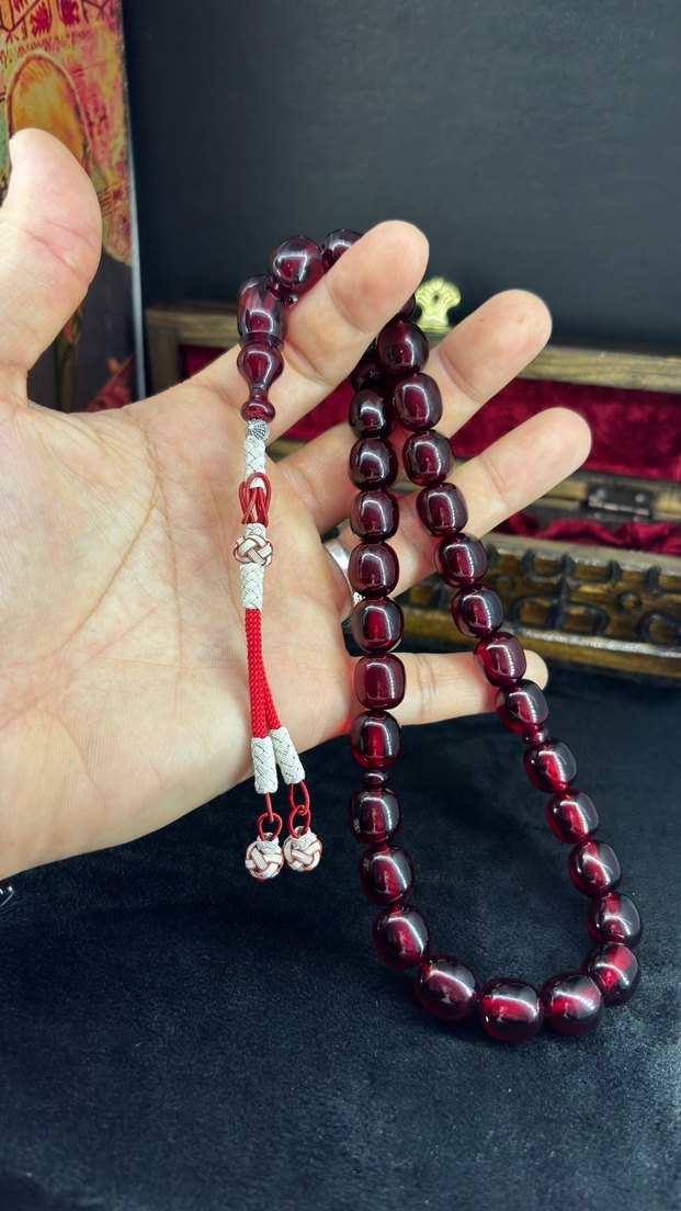 Bordo renkli, geleneksel tasarımlı erkek tesbih boncukları, parlak ve pürüzsüz boncuklar ile renkli detaylara sahiptir.