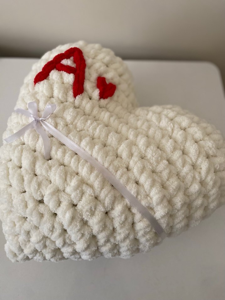 Puffy, büyük boy kırmızı renk "A" ve küçük kalp detaylı krem rengi kalp şeklinde yastık.