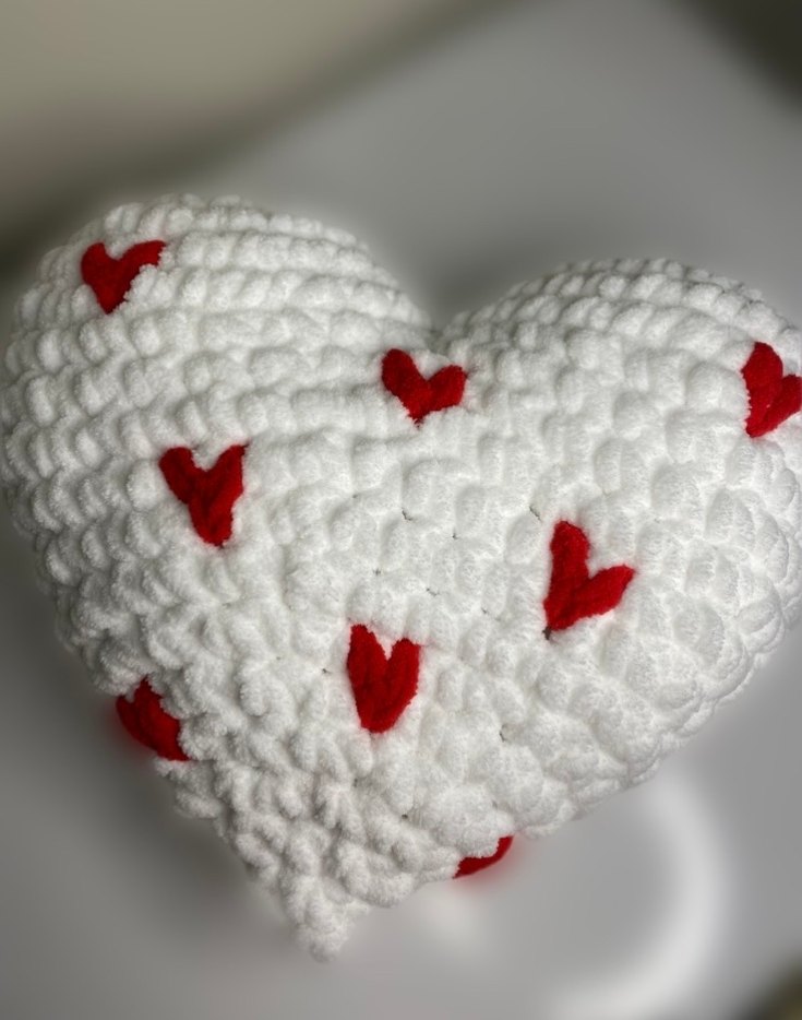 Yumuşak dokulu beyaz kalp şeklinde yastık, renkli kırmızı nakışlı kalplerle süslenmiştir. ❤️