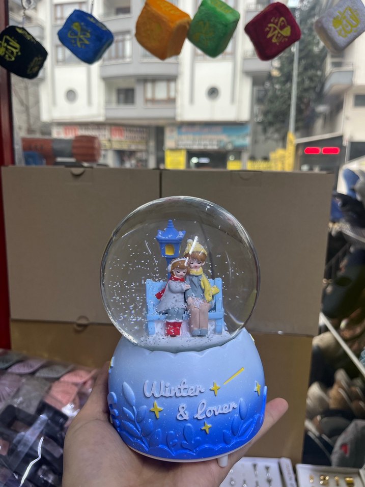 Renkli mavi kar küresi içinde bankta oturan iki figürlü kış teması. Tabanında 'Winter & love' yazısı ve yıldız, yaprak detayları bulunur. Işıklı, müzikli ve hava püskürtmelidir ❄️