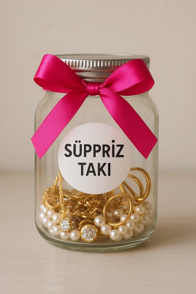 Büyük boy cam kavanoz içinde özel olarak hazırlanmış geniş takı seti: •2 adet paslanmaz çelik şahmeran bileklik •4 adet paslanmaz çelik kolye •3 adet paslanmaz çelik bileklik •2 adet paslanmaz çelik küpe •1 adet halhal 12 adet ürün