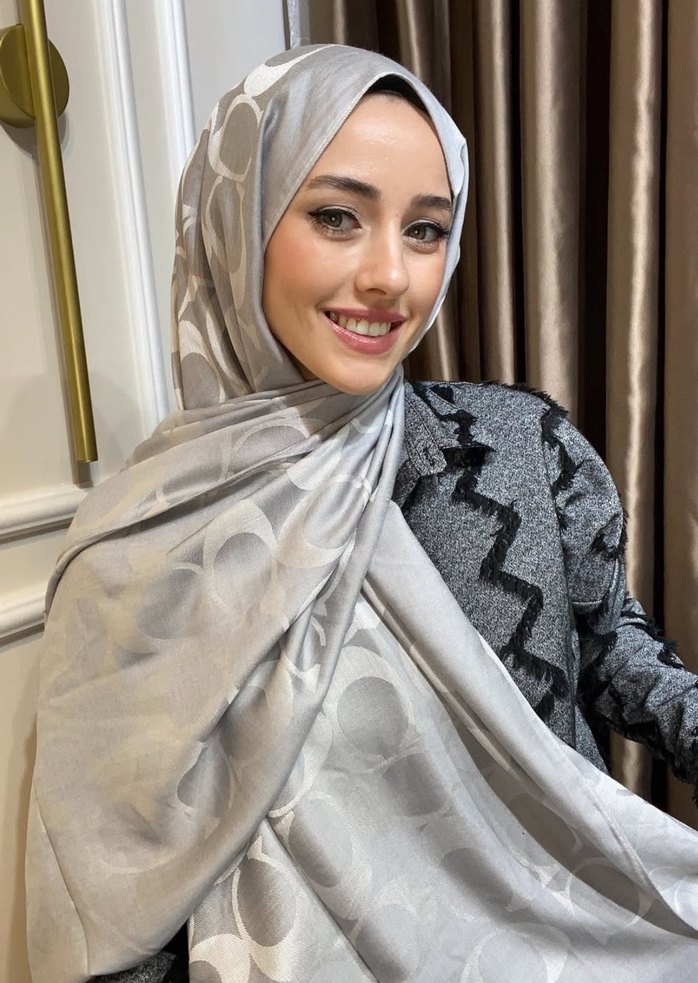 Kadın şal, ipek görünümlü yumuşak dokusu ve drapeli tasarımıyla çağdaş, gösterişli ve gri renkte zarif bir görünüme sahiptir.