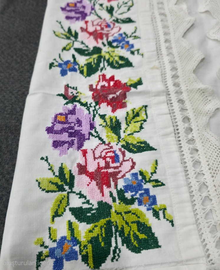 Büyük çiçekli Aydın işi kanaviçe yastık parçaları