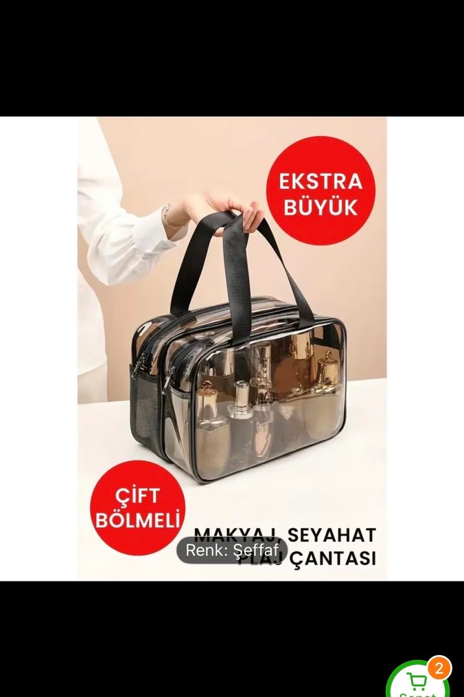 Siyah ve şeffaf renkte, çift bölmeli ve fermuarlı büyük makyaj çantası. Dayanıklı plastikten üretilmiş, seyahat için uygun ve baskılı desene sahip. Sipariş için ilan açtırınız.