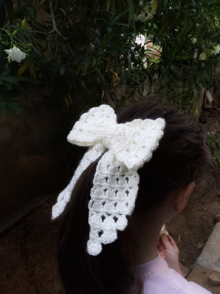 Beyaz örgü malzemeden yapılmış, fiyonk detaylı vintage goth tarzı saç aksesuarı. Hafif ve şık görünüm sağlar.