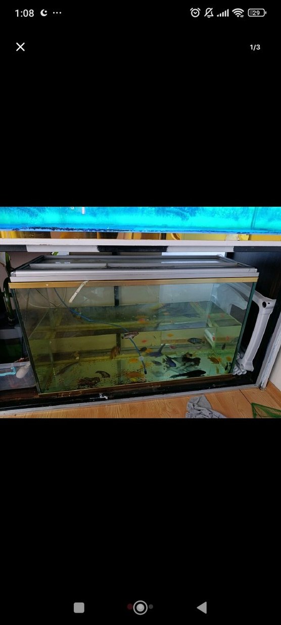 Büyük, mavi renkte, şeffaf camdan yapılmış akvaryum su canlıları için uygundur. ölçüleri uzunluk 110 yüksek lik 62 genişlik 40 ihtiyaç fazlasıdır