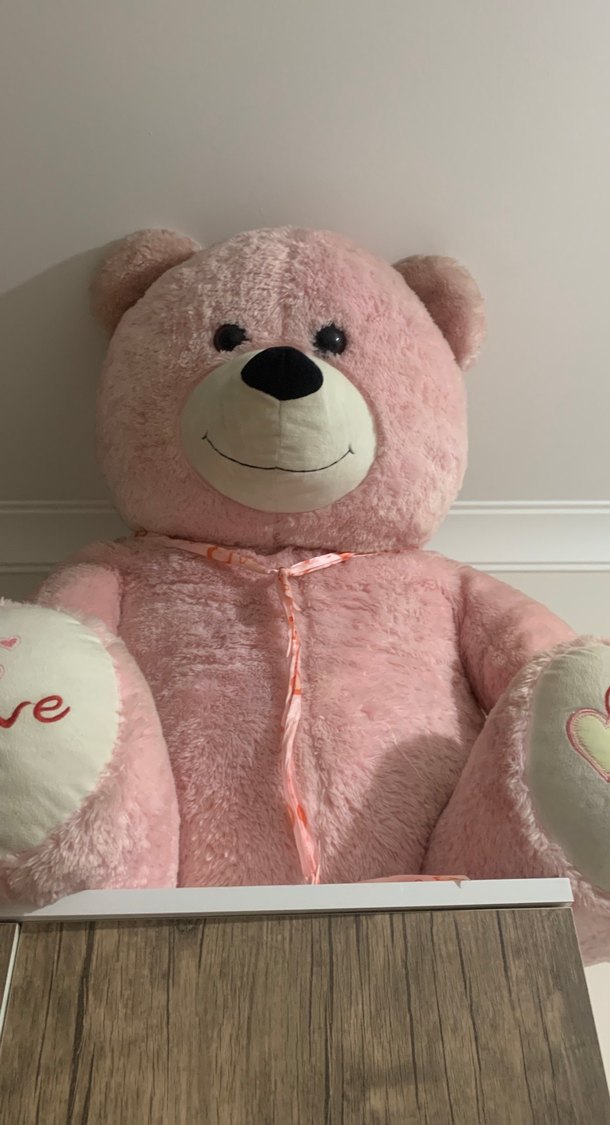 Yumuşak kumaştan yapılmış, pastel pembe büyük peluş ayı oyuncak. Pati kısımlarında nakış detaylar bulunur.
