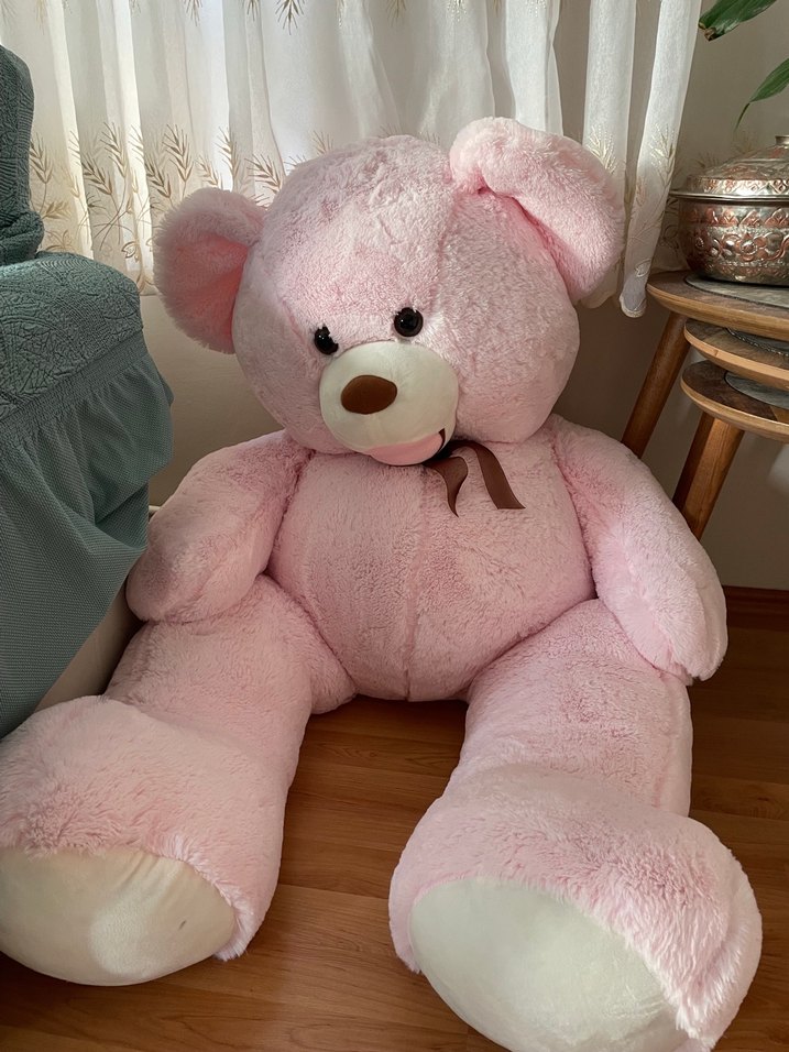 Yumuşak kumaşlı büyük pembe peluş ayı oyuncak, boynunda küçük kahverengi kurdele ile