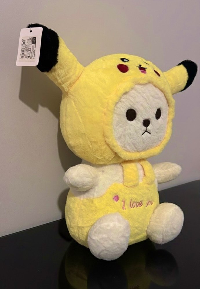 Yumuşak peluş oyuncak, sarı kostüm içinde sevimli yüz detayları ve üzerinde 'I love you' yazısı ile.