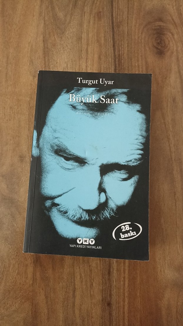 Turgut Uyar'ın 'Büyük Saat' biyografi kitabı, Yapı Kredi Yayınları'ndan 28. baskı. Kapakta yazarın yakın çekim portresi var.