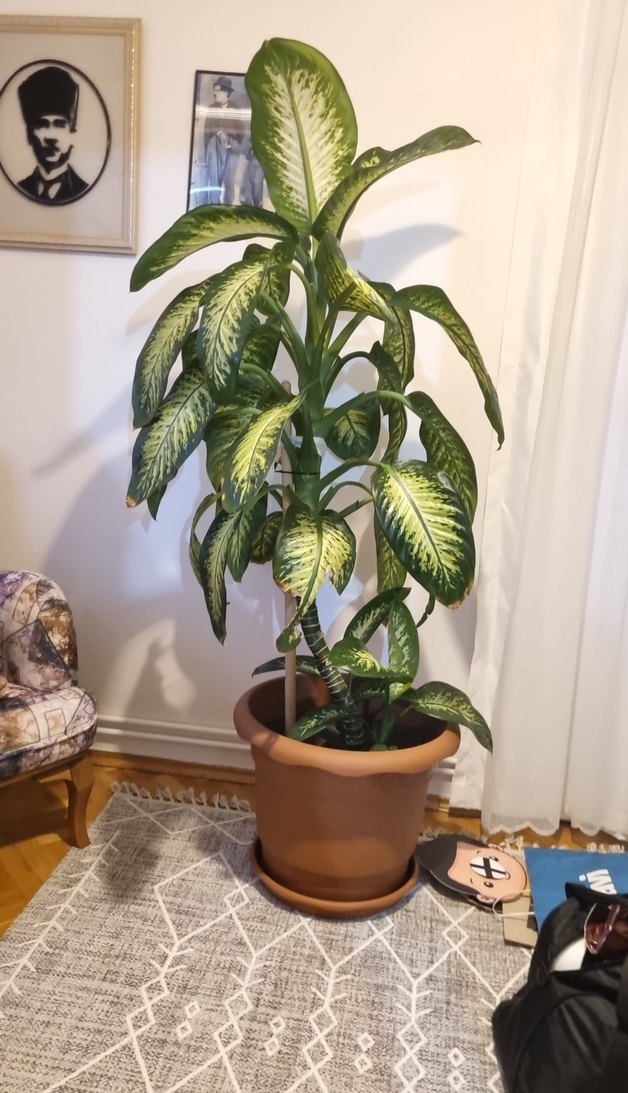 Kahverengi saksıda büyük, desenli yapraklı yeşil ev bitkisi, iç mekanlara doğal bir dokunuş katıyor.