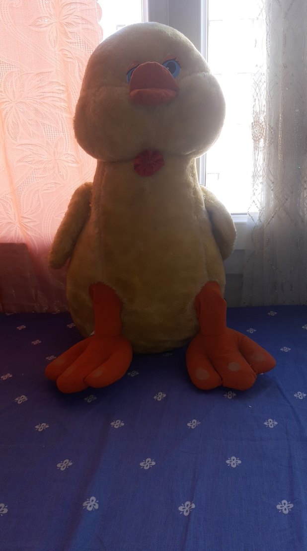 Yumuşak ve pastel tonlarda kahverengi peluş ördek oyuncak, turuncu ayaklı, sarılmak için uygun. kolunun bir tanesinin dikilmesi gerek ve yıkanması gerek onun dışında bir problemi yok