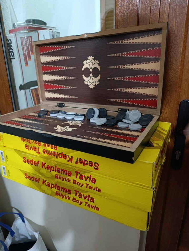 Büyük boy, koyu kahverengi sedef kaplama tavla seti. Siyah ve beyaz pullarla birlikte sağlam kutusunda sunulur.