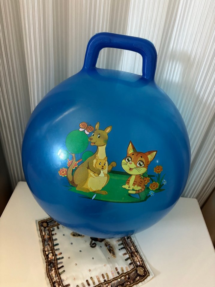 Çocuğum çok az kullandı fazlalıktan dolayı satıyorum . Saplı mavi oyuncak top, renkli çizgi film hayvan figürleriyle süslenmiş. Oyun ve egzersiz için uygun.