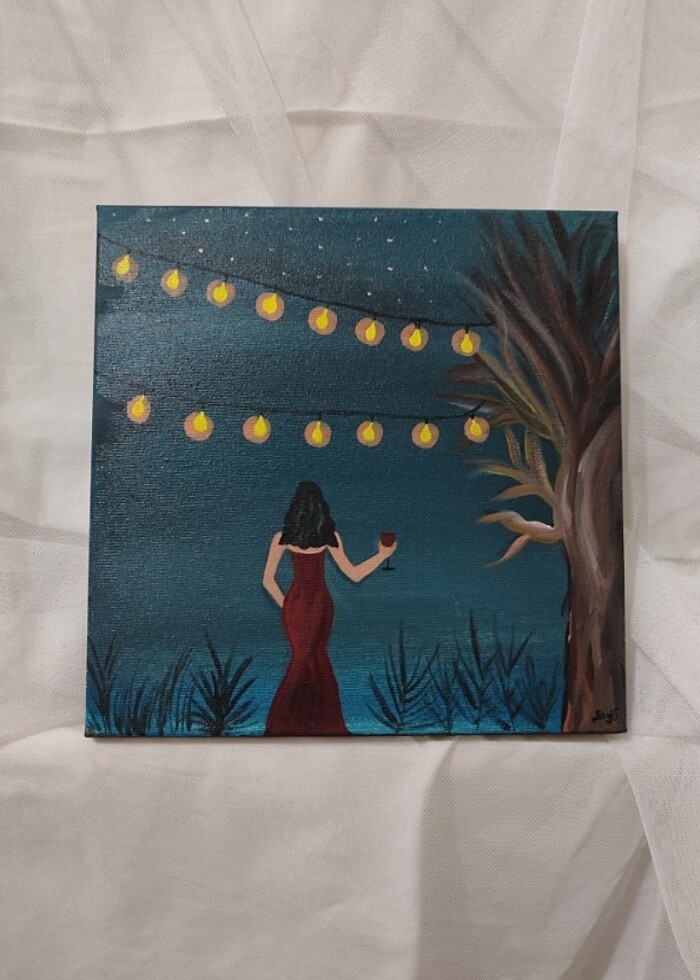 Kendi tasarım ve çalışmamdır. 20x20 ölçülerindedir. Astarlı ve verniklidir. Akrilik boya ile yapılmıştır.