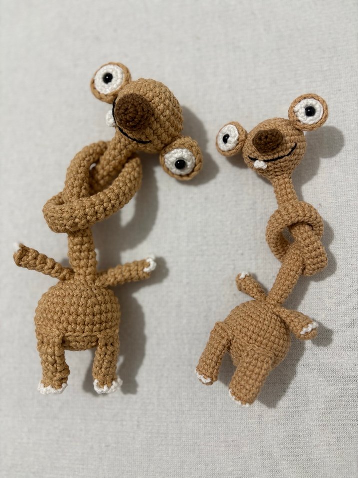 Yumuşak kumaştan yapılmış renkli Sid figürlü amigurumi oyuncaklar, detaylı göz ve buruna sahip. Esnek uzuvları ve eğlenceli tasarımı var.