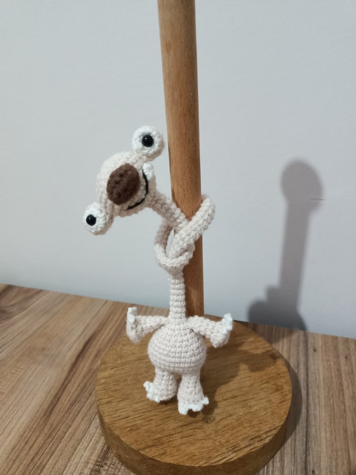 Beyaz ve krem renkte, büyük gözlü, el örmesi küçük oyuncak. el yapımı çanta aksesuari