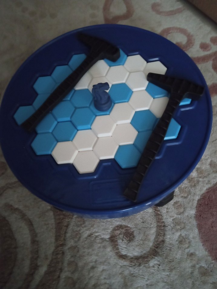 Koyu mavi taban üzerinde mavi ve beyaz altıgen bloklardan oluşan eğitici oyuncak. İki siyah çekiç aracı içerir.