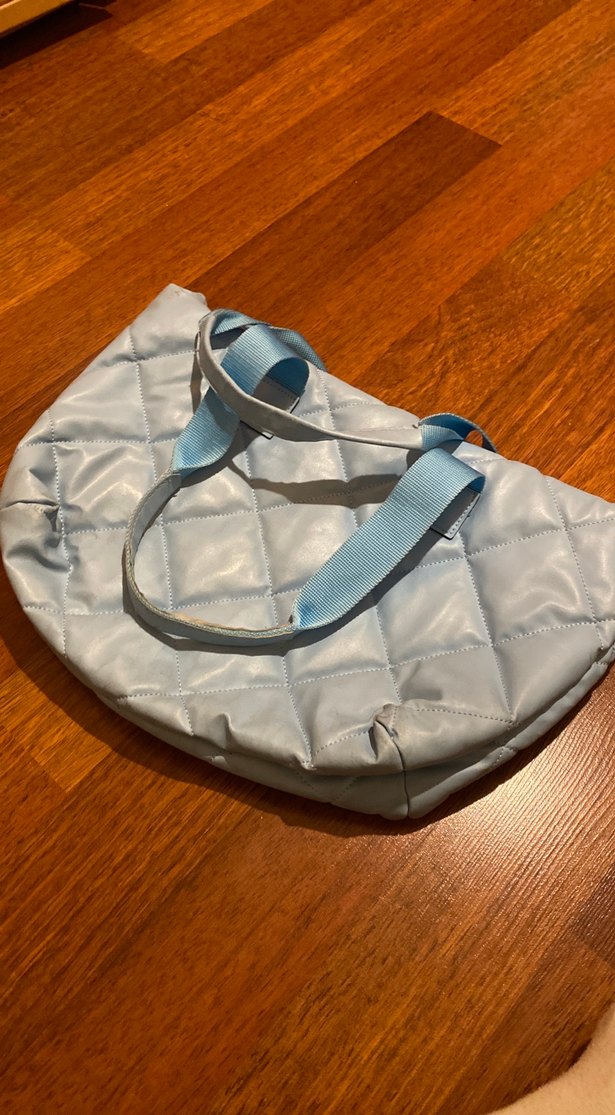 Kapitone desenli, gri ve mavi tonlarında sentetik kumaştan, tokalı askılara sahip kadın çantası. Minimalist ve trend sokak tarzı için uygun.
