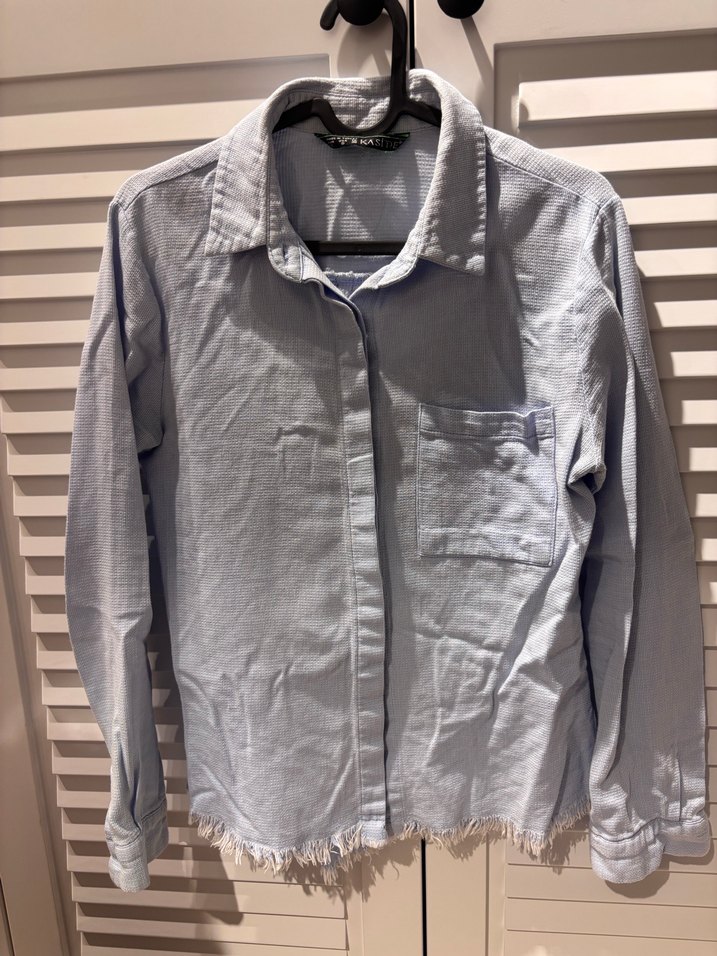 Buz Mavi keten kumaştan, yakalı, düğmeli, uzun kollu ve normal kesim kadın gömleği. Göğüs cebine ve salaş kesime sahip, günlük sokak stili için uygun.