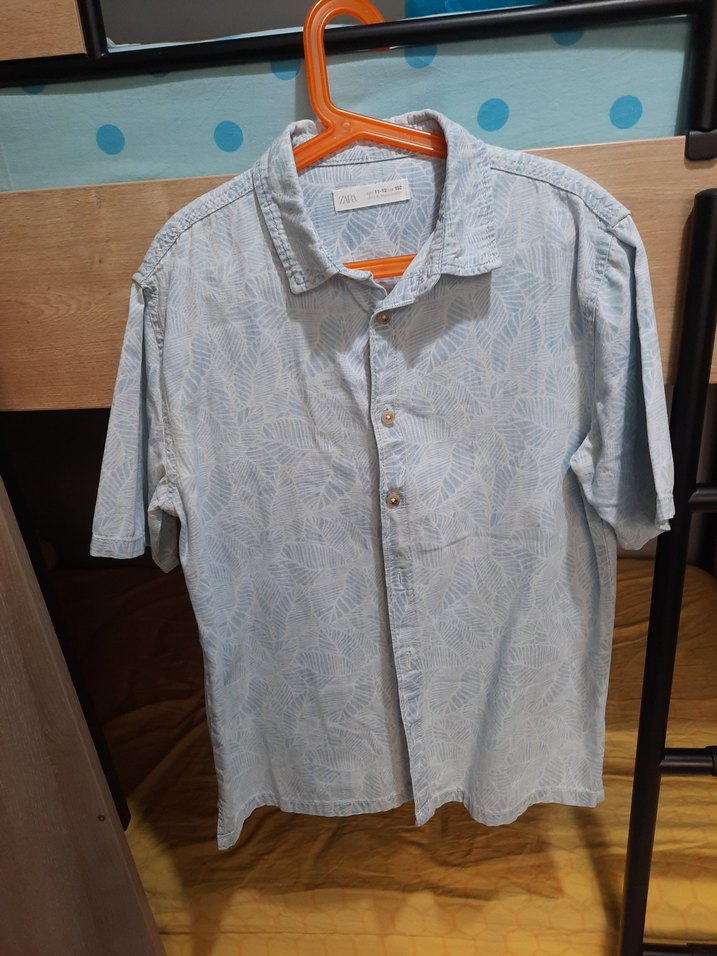 Zara Pamuk kumaştan, düğmeli ve kısa kollu buz mavisi erkek gömleği. Salaş kesimi ve hafif batik desenli, günlük rahat kullanım için uygundur.