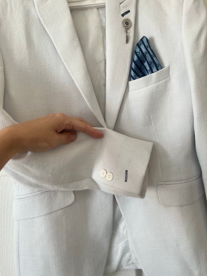 Beyaz renkte, düğmeli ve kesik yakalı erkek cocuk ceket. Uzun kollu, regular fit. Desensiz ve cep mendili detaylı.