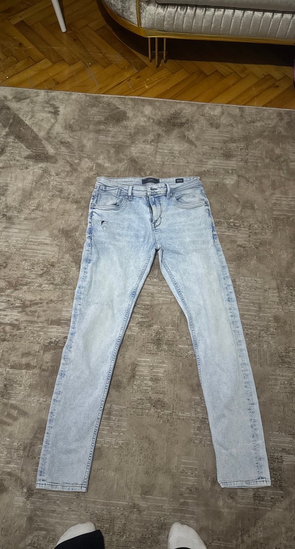 Buz mavisi renkte, regular fit kesime sahip denim erkek jean. Günlük kullanıma uygun, desen içermeyen rahat ve şık bir görünüme sahiptir bir kere giyildi