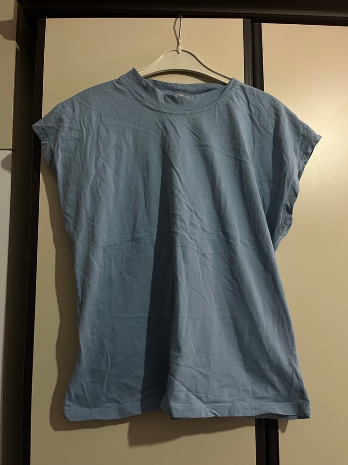 Buz mavisi renkte, kısa kollu, yuvarlak yakalı keten kumaştan yapılmış, rahat kesim kadın tişörtü. Minimalist tarzıyla günlük kullanıma uygundur.