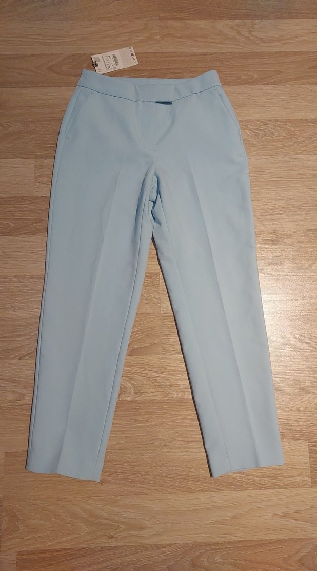 Mavi midi boyda, regular fit kumaş pantolon. Ofis için uygun, düz ve sade şıklık sunar. NOT: ÜRÜN HİÇ GİYİLMEDİ KARGO AŞAMASINDA ZARA ZARFI YIRTILMIŞ UFAK LEKESİ VARDI LEKE BÖLGESİ YIKANDI