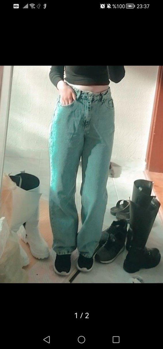 Mavi pastel renk loose fit kot pantolon, midi boy ve desen içermeyen rahat kesimiyle günlük sokak stiline uygun şık bir parça.