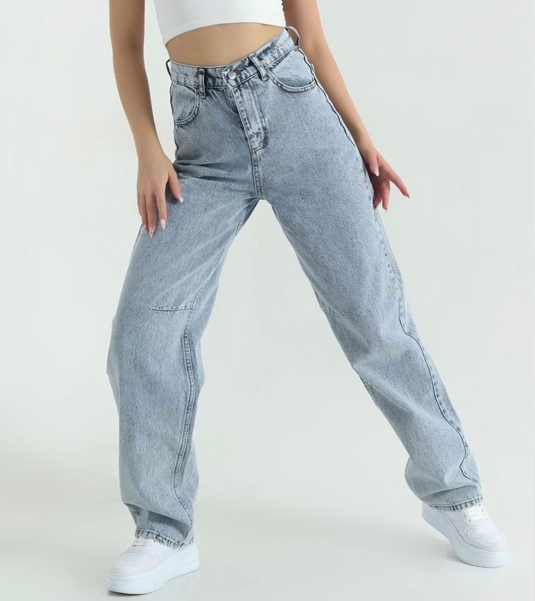 Buz Mavisi Tokalı Cepli Baggy Kadın Kot Pantolon