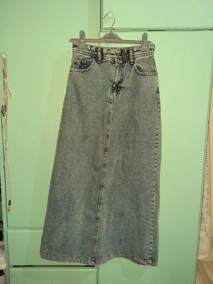 buz mavisi uzun kot etek, bol kesim ve kemerli bel ile günlük rahat ve normcore stil sunar.
