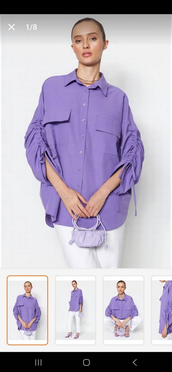düğmeli, salaş kesim uzun kollu kadın gömlek. Ayarlanabilir büzgülü kollar, bisiklet yaka ve iki göğüs cebi bulunur. Büyük geldiği için satıyorum hiçbir sorunu yoktur