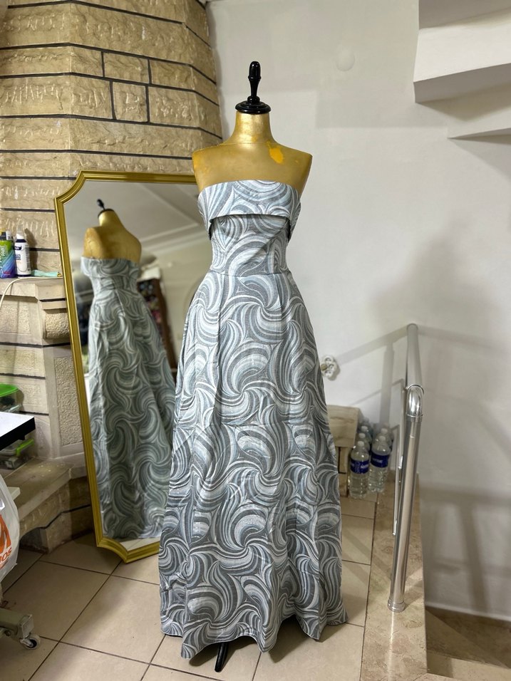 Bu uzun gri elbise, straplez yaka ve büzgülü tasarıma sahip. Batik desenli, regular fit ve kolsuz, düğünler için uygun avant-garde tarzda. 34-36-38 bedenler için uygundur.