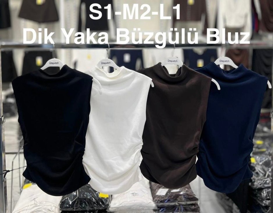 Beyaz, büzgülü yakalı, kolsuz, dar kesim, normal midi boyda, sentetik kumaştan yapılmış kadın bluz. Trendy günlük kullanım için uygundur.
