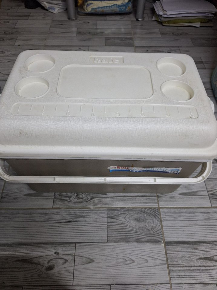 Beyaz ve gri renkli, üstünde çoklu bardaklıkları olan büyük buzluk