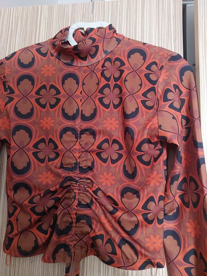 Düğmeli, yüksek yakalı ve uzun kollu, koyu kahverengi retro desenli, sentetik kumaştan yapılmış bohem tarzda kadın bluz.